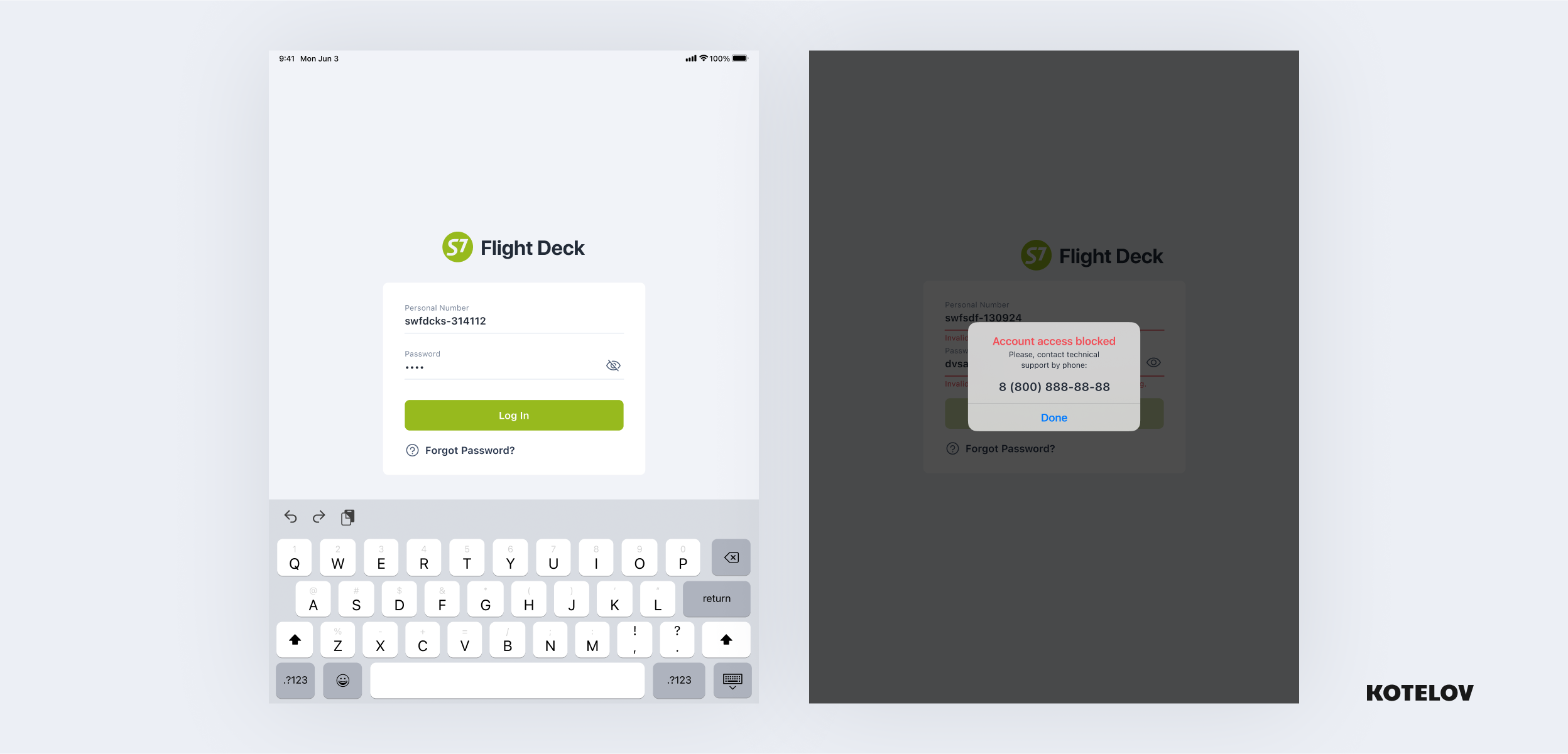 The pilot enters their employee ID and password. We adopted this authentication method because it uses the same credentials across all the company systems, ensuring that the pilot won’t forget them before the flight. However, after 10 incorrect password attempts, the system locks, and the access can only be restored through the administrator. This is for the sake of data security in case the tablet is lost: