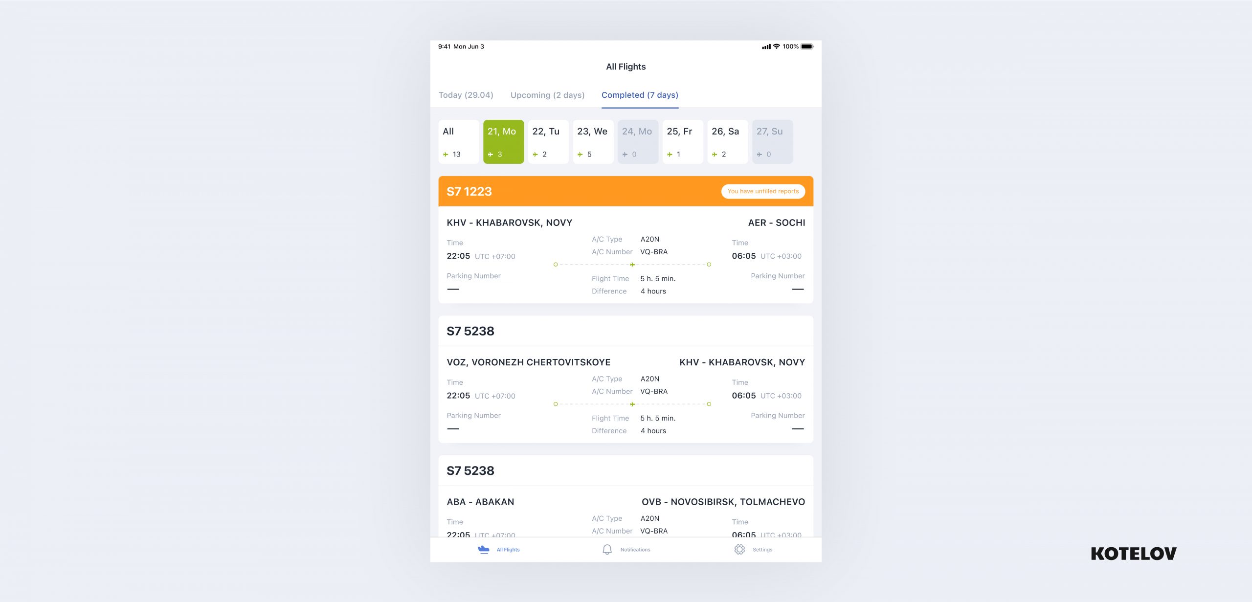 We’ve designed a user-friendly flight calendar. The pilot can view their workdays, and we also highlighted non-operational flights in inactive blocks. We differentiated flights for which the pilot hasn’t completed reports by marking them.