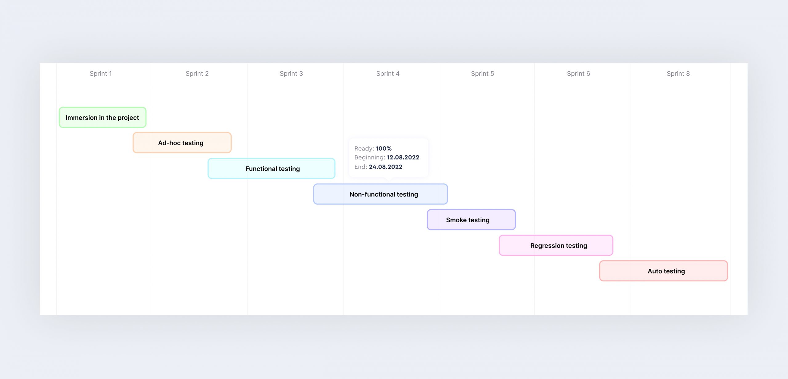 Even before we actually signed the contract with the client, we described all the bugs that we found during the pre-project study, and also recorded a video of the incident so that the client could see how we would find and file bugs in Jira. Afterwards, the testing implementation structure was distributed by sprints.