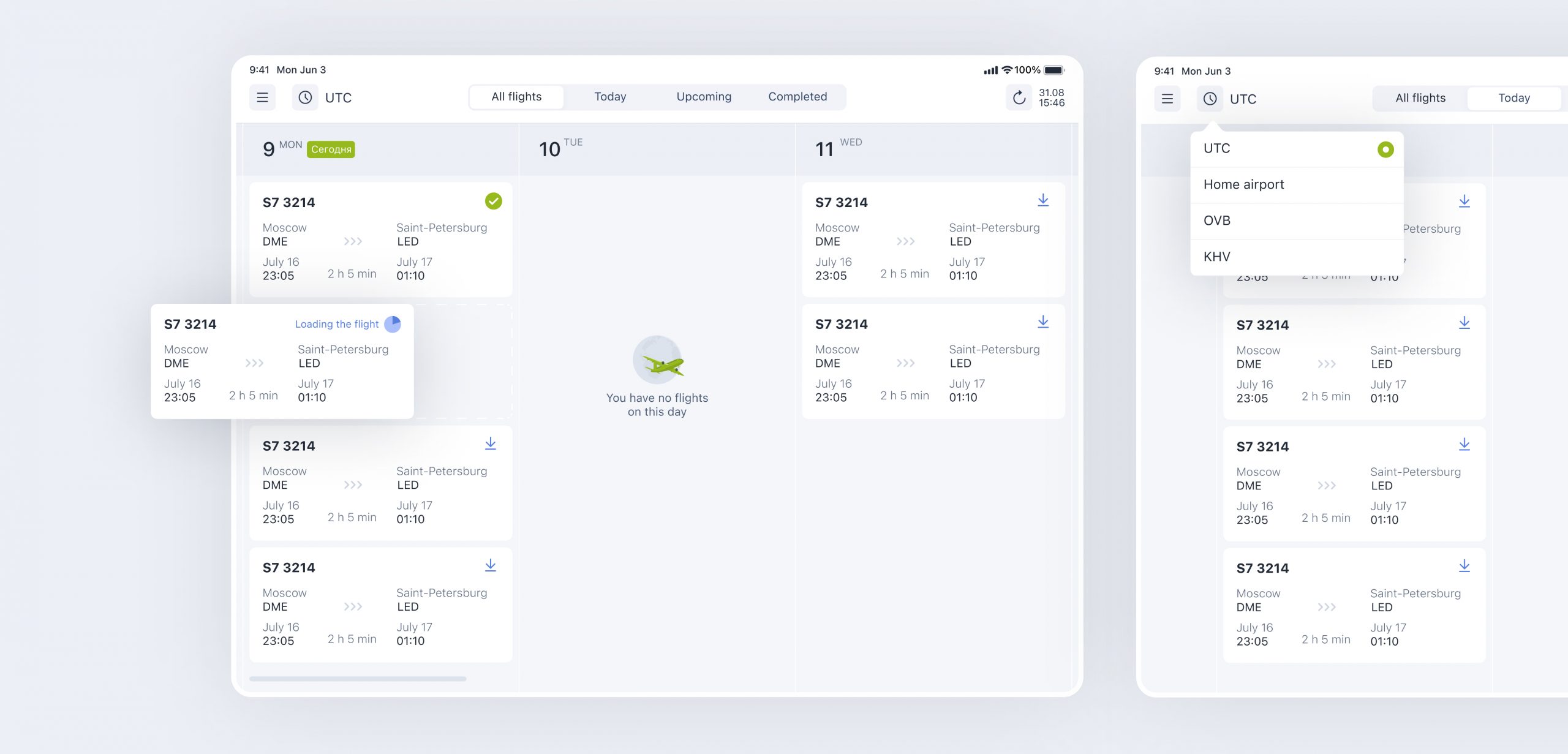 Convenient flight schedule is able to display UTC time, home airport time, and destination time.