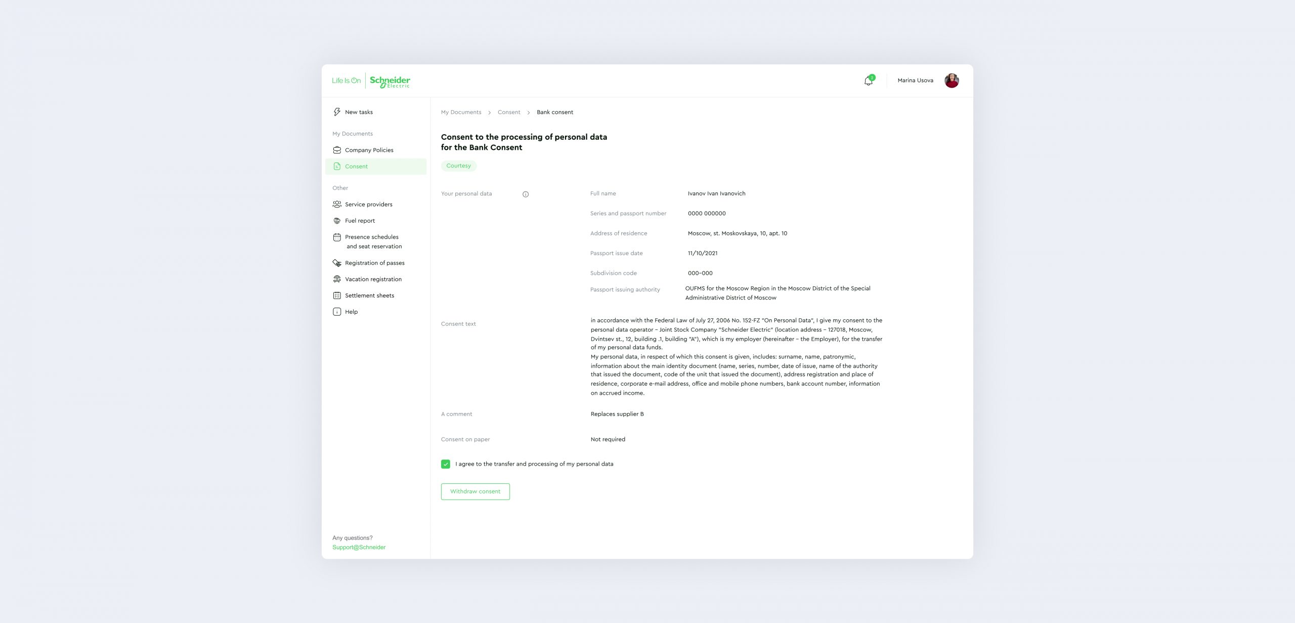 If an employee decides that they no longer want to use the services of a particular supplier for some reason, they can recall the consent. There is no need to notify the manager and HR administrator anymore. Each of them will automatically receive notifications about employees’ recalls from their departments.