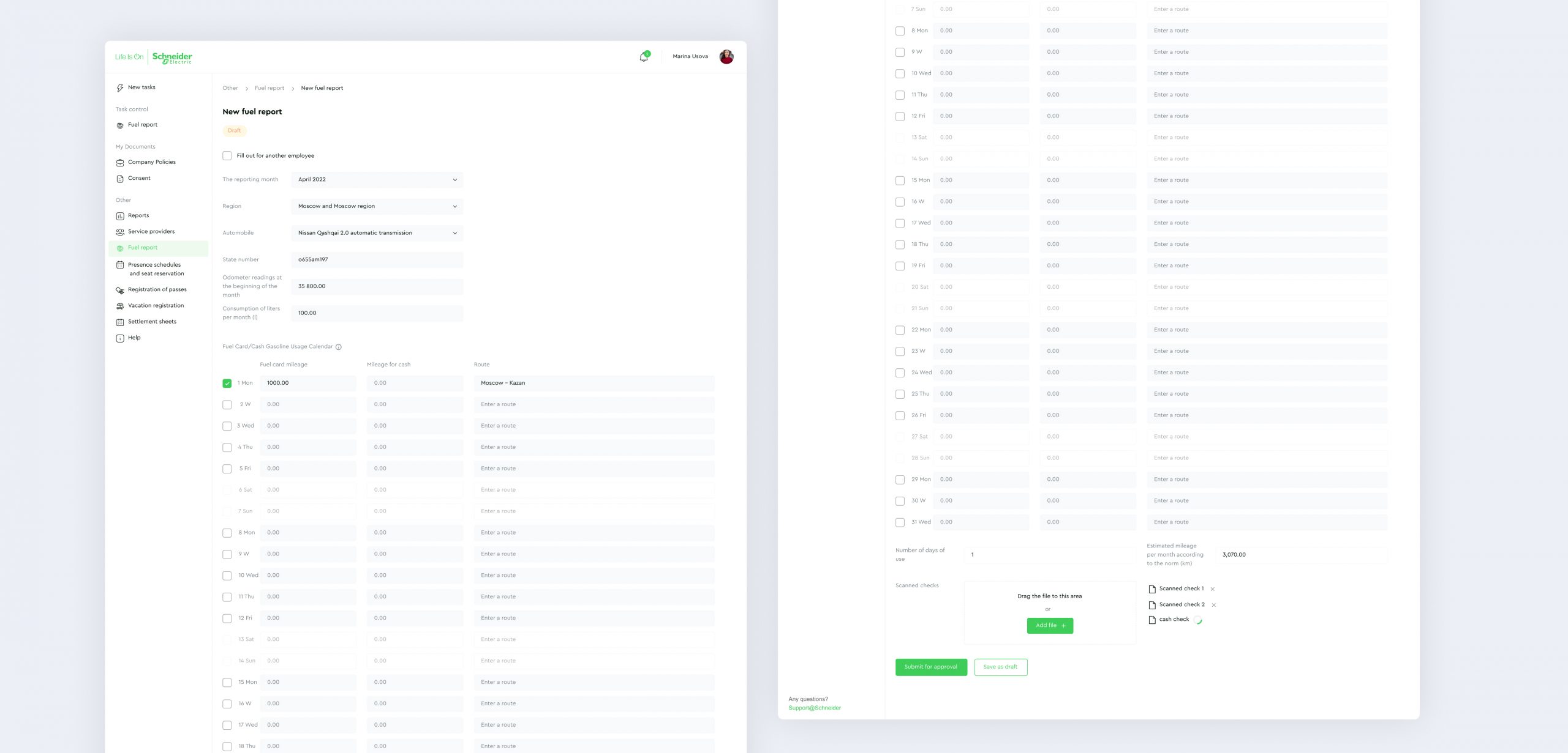 In addition to the workflow of HR departments, we have created a tool for filling and approving fuel reports. Employees using corporate cars can create a fuel report for a specific month, upload receipts and routes. The system will automatically calculate the mileage or fuel consumption to input in the system based on the indicated data.