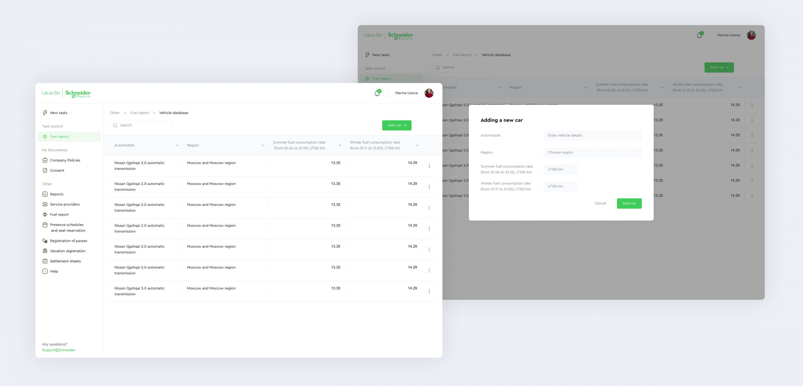 Administration of the vehicle database and approval of the fuel report are also available in the Personal Account. Employees used Excel spreadsheets before.