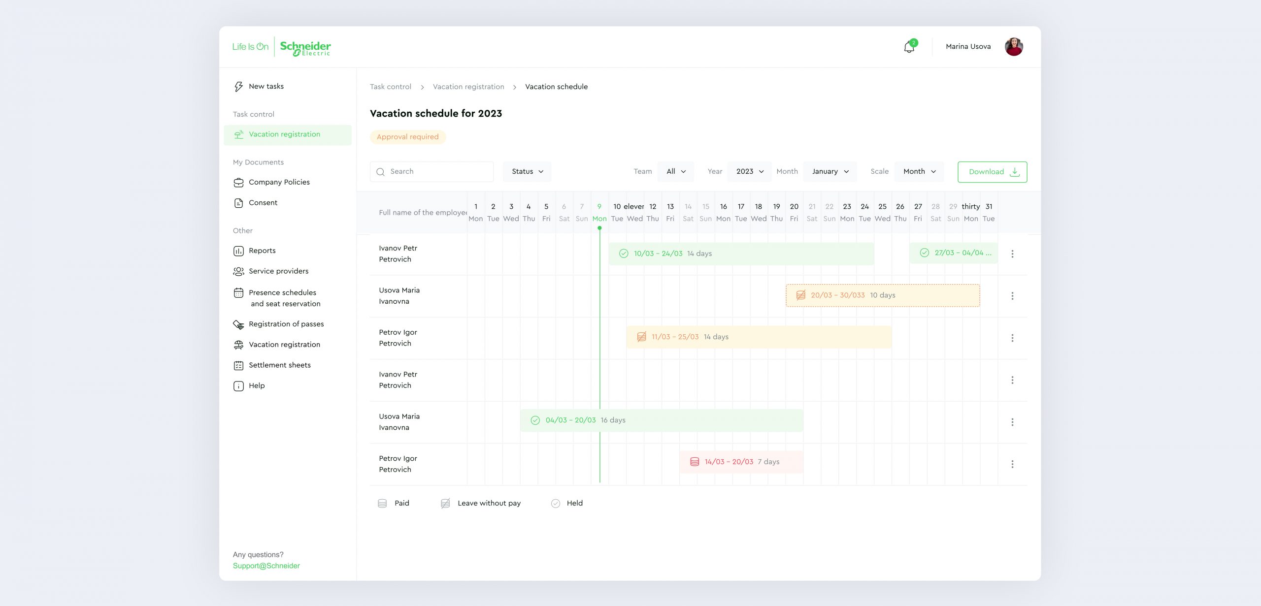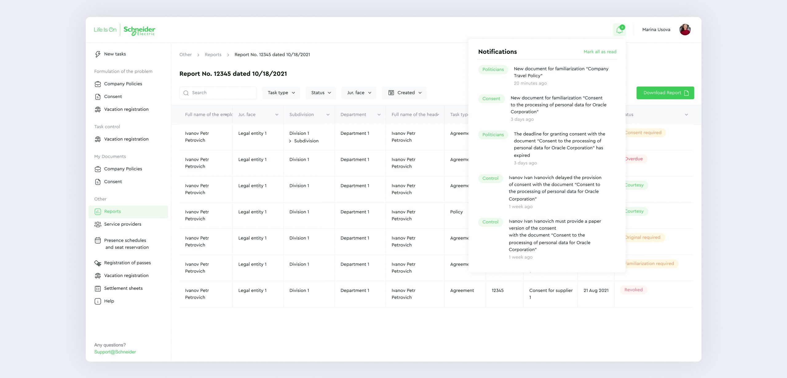 To ensure data privacy and safety, all users have access only to the sections they require, based on the role model principle. The department heads and administrators will receive notifications and view information on their subordinates only